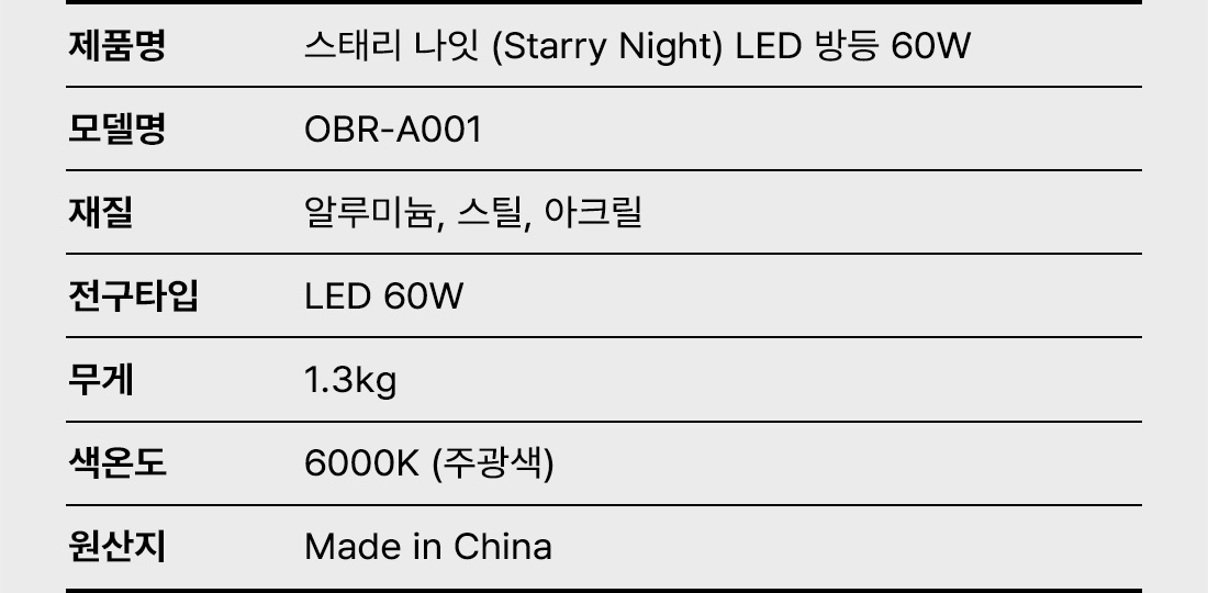 ºû, ½ºÅ¸ÀÏÀ» ÀÔ´Ù. OBR LIGHTING ¿À´Ã ÀÔÀº ¿ÊÀÌ ´ç½ÅÀÇ ±âºÐÀ» ¸»ÇØÁÖµí, °ø°£ÀÇ ºûµµ ´ç½ÅÀÇ ÃëÇâÀ» º¸¿©ÁÖ¾î¾ß ÇÕ´Ï´Ù. ºñÃ÷°¡ Á¦¾ÈÇÏ´Â »õ·Î¿î ¶óÀÌÆÃ ÇÁ·ÎÁ§Æ®. ÀÌÁ¦ Á¶¸íµµ ÆÐ¼Çó·³, ¿øÇÏ´Â ´ë·Î °¥¾ÆÀÔÀ¸¼¼¿ä. ¿Ö ¿Àºê¸¯ ¸ðµâ Á¶¸í Àϱî¿ä? ÀÌÁ¦, ½º¸¶Æ®Æù ÄÉÀ̽º ¹Ù²Ùµí Ä¿¹ö¸¸ 'Åå' ¹Ù²Ù¼¼¿ä. ºñ¿ë ºÎ´ã°ú ȯ°æ ¿À¿°À» À¯¹ßÇÏ´Â ÀÏ¹Ý ¹æµî°ú ´Þ¸®, ¿Àºê¸¯ ¸ðµâ Á¶¸íÀº ¹Ý°ª °æÁ¦¿Í ģȯ°æ ¼Òºñ¸¦ ½ÇõÇÕ´Ï´Ù. POINT 01. ¿À´Ã ÀÔÀ» ¿Ê °í¸£µí, °¡Àå ½¬¿î ºûÀÇ ½ºÅ¸Àϸµ ¹«°Å¿î µî±â±¸¸¦ ¶¼¾î³¾ ÇÊ¿ä ¾øÀÌ Ä¿¹ö¸¸ °¡º±°Ô ±³Ã¼Çϼ¼¿ä. °èÀýµû¶ó ±âºÐµû¶ó, ¿ÊÀ» °¥¾ÆÀÔÈ÷µí ½±°í °£ÆíÇÕ´Ï´Ù. POINT 02. ´«ºÎ½ÉÀº ÁÙÀÌ°í ¹à±â´Â °í¸£°Ô ±¤È®»ê ·»Á Àû¿ëÇÏ¿© LED ƯÀ¯ÀÇ Á÷±¤ ´«ºÎ½ÉÀ» ÃÖ¼ÒÈÇÏ°í °ø°£ Àüü¿¡ ºÎµå·´°Ô ÆÛÁö´Â ºûÀ» ±¸ÇöÇß½À´Ï´Ù. POINT 03. ÁýÁßÀ» À§ÇÑ ¼±¸íÇÑ ÁÖ±¤ºû ºÒÇÊ¿äÇÑ »ö»ó Àüȯ ¾øÀÌ ÁÖ±¤»ö ´ÜÀÏ »ö¿Âµµ·Î ¼³°èµÈ Á¶¸íÀÔ´Ï´Ù. ¾ðÁ¦³ª ÀÏÁ¤ÇÑ ¹à±âÀÇ ºûÀ¸·Î °ø°£À» ¼±¸íÇÏ°Ô ¹àÇôÁÝ´Ï´Ù. POINT 04. ±ôºýÀÓ ¾ø´Â ¾ÈÁ¤ÀûÀÎ Àü¿ø DC ŸÀÔ ÄÁ¹öÅÍ DC ŸÀÔ ÄÁ¹öÅÍ Àû¿ëÀ¸·Î Àü¾Ð º¯µ¿¿¡µµ ¾ÈÁ¤ÀûÀÎ Á¡µîÀÌ °¡´ÉÇÕ´Ï´Ù. #Çø®Ä¿ Çö»ó ÃÖ¼ÒÈ #¼ÒÀ½ °¨¼Ò #Àå½Ã°£ »ç¿ë¿¡µµ ¾ÈÁ¤Àû POINT 05. º¸ÀÌÁö ¾Ê´Â ¶³¸²±îÁö ÀâÀº ¿Ïº®ÇÑ Çø®Ä¿ ÇÁ¸® ¸Ç´«À¸·Î´Â º¸ÀÌÁö ¾ÊÁö¸¸ ´«À» ÇÇ·ÎÇÏ°Ô ¸¸µå´Â ºûÀÇ ±ôºýÀÓ(Flicker)À» Â÷´ÜÇß½À´Ï´Ù. ¿ì¸® °¡Á·ÀÇ ½Ã·ÂÀ» º¸È£ÇÏ´Â °Ç°ÇÏ°í ±ú²ýÇÑ ºûÀÔ´Ï´Ù. (TIP Çø®Ä¿¶õ? ´«ÀÌ ÀÎÁöÇÏÁö ¸øÇÏ´Â ¼Óµµ·Î ºûÀÌ ±ôºýÀÌ´Â Çö»óÀ¸·Î Áö¼ÓÀûÀ¸·Î ³ëÃ⠽à ´«ÀÌ ÇÇ·ÎÇÒ ¼ö ÀÖ½À´Ï´Ù.) KS ÀÎÁõ Á¦Ç° ¾È½ÉÇÏ°í »ç¿ëÇϼ¼¿ä! KS C 7653 KTC 2016-0237 [Á¦Ç° ½ºÆå] Á¦Ç°¸í: ½ºÅ¸® ³ªÀÕ (Starry Night) LED ¹æµî 60W ¸ðµ¨¸í: OBR-A001 ÀçÁú: ¾Ë·ç¹Ì´½, ½ºÆ¿, ¾ÆÅ©¸± Àü±¸Å¸ÀÔ: LED 60W ¹«°Ô: 1.3kg »ö¿Âµµ: 6000K (ÁÖ±¤»ö) ¿ø»êÁö: Made in China
